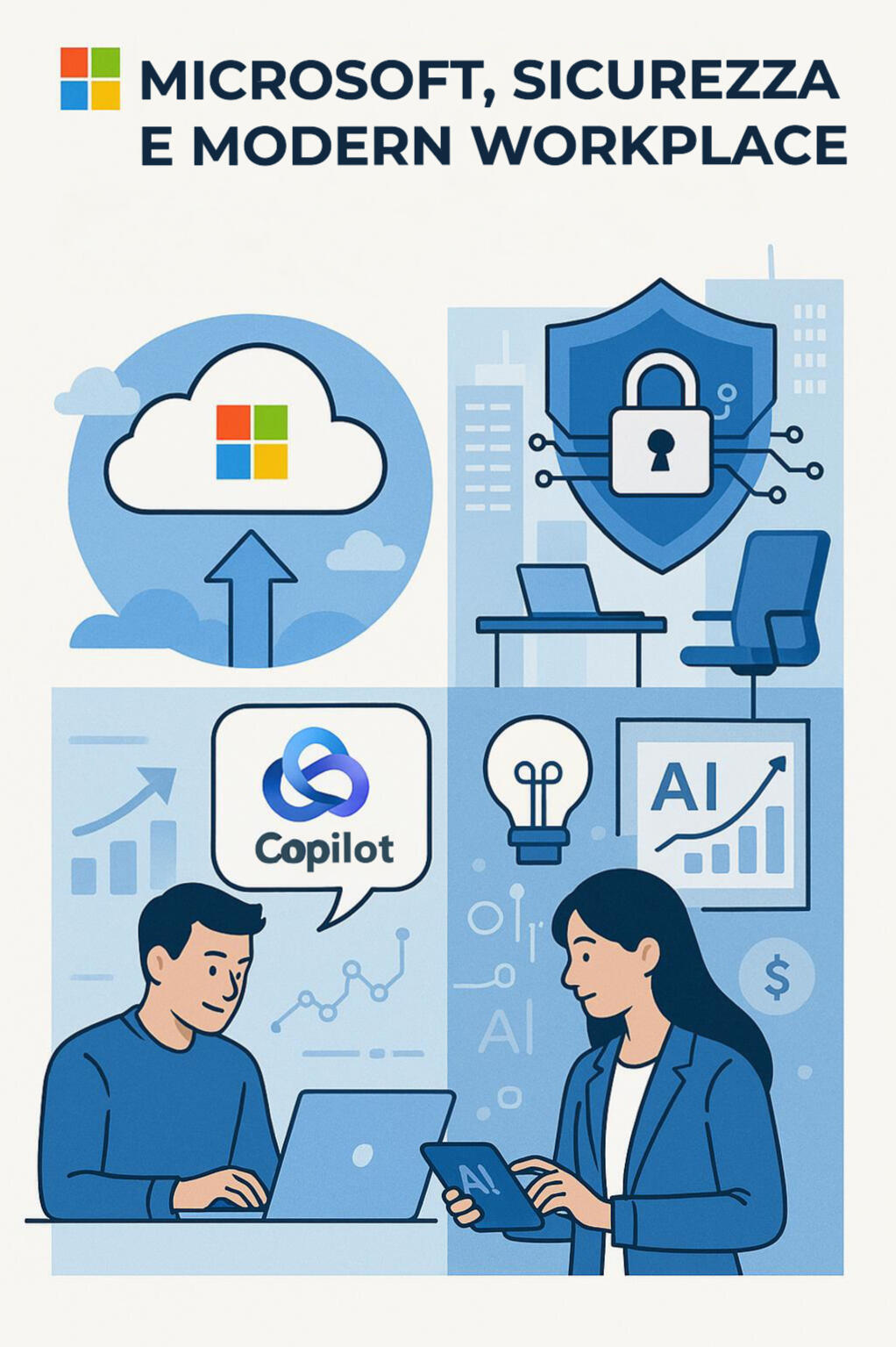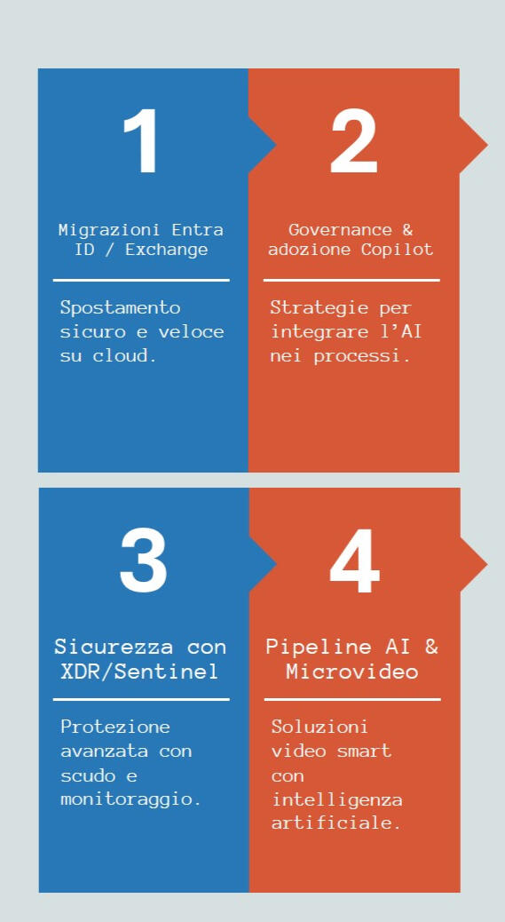 Cloud migrattion, sicurezza XDR/Sentinel per NIS2, adozione Copilot, formazione e consulenza.